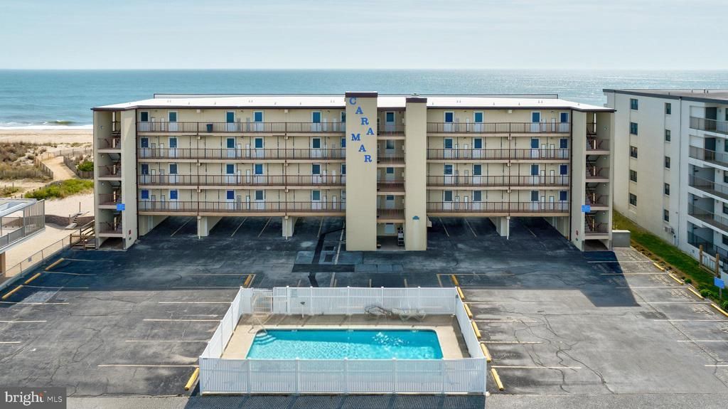 Introducing a rare direct oceanfront end unit in Cara Mar in north Ocean City! This unit offers an unparalleled coastal living experience, boasting breathtaking views of the dunes and the expansive ocean. This unit provides panoramic vistas that extend as far as the eye can see. The interior showcases wide plank LVP flooring, bright walls, and a tastefully updated bath. Enjoy a well-appointed kitchen with stainless steel appliances, crisp white cabinets and upgraded countertops. The living area is highlighted by a handsome Murphy bed set-up and expansive glass sliding doors leading to a private balcony where you can savor your morning coffee or evening libation while immersing yourself in the fabulous ocean view. This oceanfront gem comes fully furnished making it hassle-free for you to embrace coastal living. The building offers amenities such as an elevator, on-site laundry center, swimming pool, and an outdoor shower to rinse off the sand after a delightful day at the beach. A on-site resident manager adds to the convenience and security of the property. For added practicality, there's a sizable storage room with a private locker beneath the building for your beach gear. Future upgrades include new hurricane shutters. Ideally situated within walking distance of Northside Park, Starbucks, Tail chasers Restaurant, Grotto Pizza, and more, this location epitomizes the convenience of coastal living. With low condo fees and taxes, this property is not only a dream home but also a lucrative investment opportunity with some existing rental reservations currently in place! Don't miss this chance to own a piece of North Ocean City's coastal paradise– where location, convenience, and stunning views converge for a truly exceptional living experience.